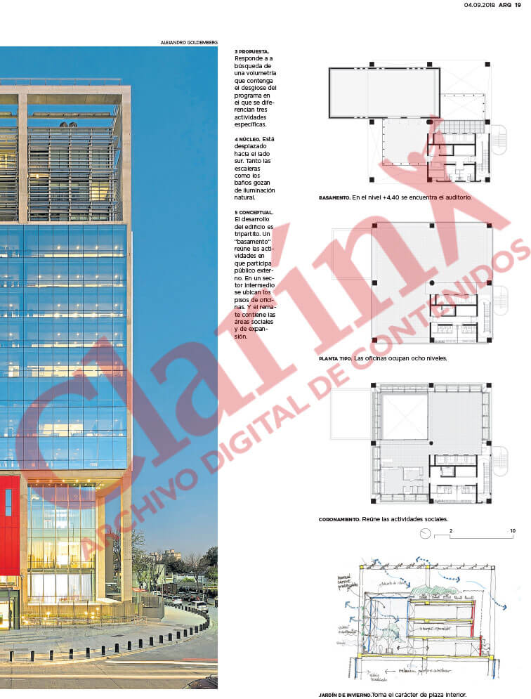 El concepto clásico de basamento, fuste y capitel es recreado en la torre corporativa para Coca Cola en una reinterpretación contemporánea que contribuye a la comunicación de la marca. “En este proyecto buscamos principalmente una imagen arquitectónica que la represente, dedicando gran parte de nuestro trabajo a la búsqueda de su personalidad”, define la memoria descriptiva del estudio M/SG/S/S/S.Torre Colca Cola - M/SG/S/S/S - ARQ Clarín- Sole Comunicaciones - tapaSegún los autores, el edificio tiene todas las soluciones tecnológicas necesarias para su certificación LEED, en cuanto a exigencias de sustentabilidad, y su personalidad reside fundamentalmente en la organización, en su proporción. “Se trata de una torre corporativa con funciones diversas en su programa las cuales deben constituir una unidad estética que exprese en su arquitectura la fuerza de la marca que representa”, explican los proyectistas de la obra.